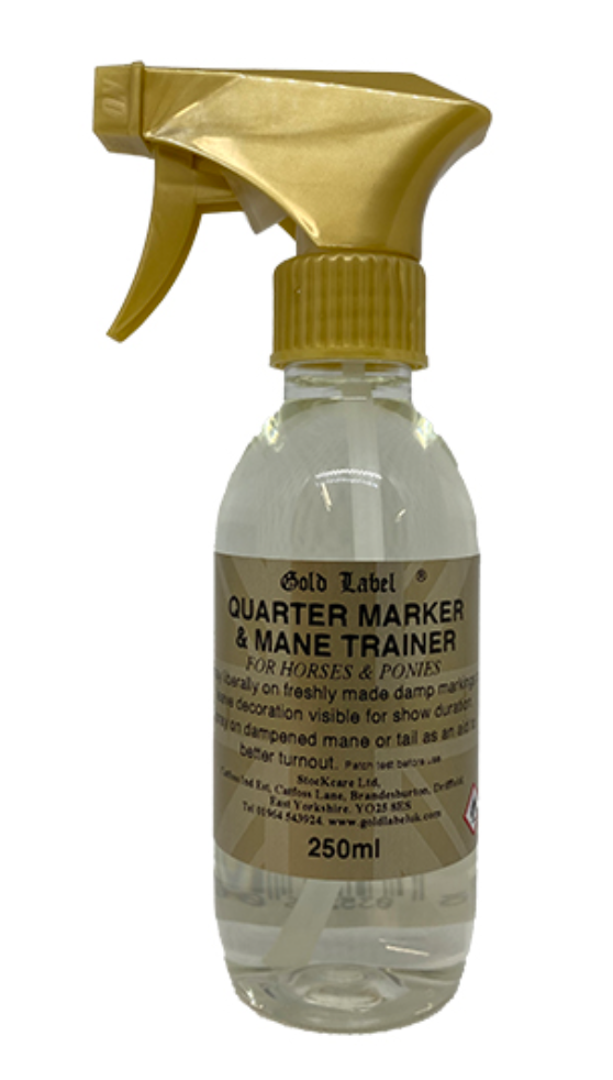 To be sprayed liberally on freshly made damp markings to leave decoration visible for the duration of the show. Spray on dampened mane or tail as an aid to better turnout.