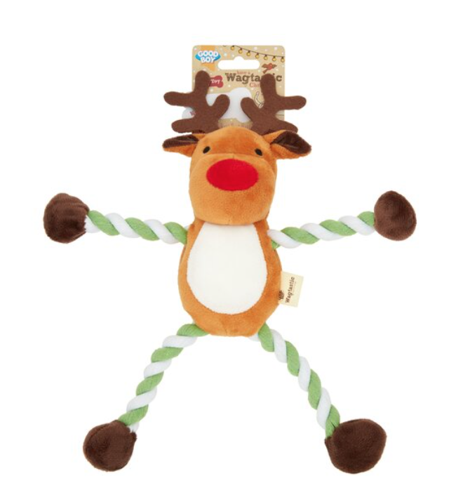 Soft and squishy, perfect for snuggling up to on a cold winters evening. With rope legs it adds different textures to play time. This will be a festive hit with any dog!