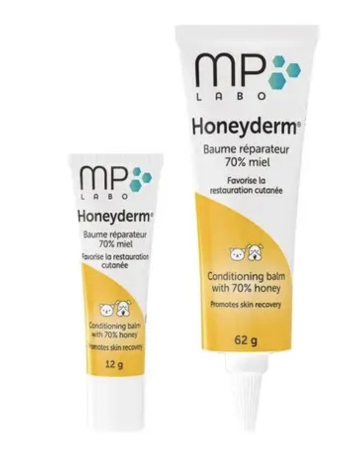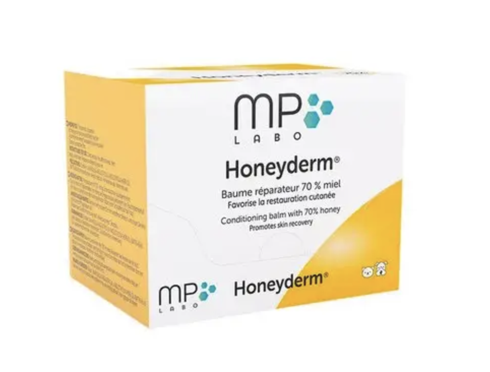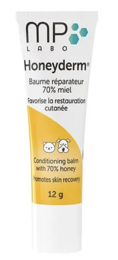 Honeyderm® Skin Conditioning Balm for Dogs & Cats is a balm with 70% honey that contributes to skin restoration. The osmotic properties of honey (70%) help to maintain a protected, moist environment and creates a protective film. MP Labo Honeyderm® Skin Conditioning Balm contains honey, vitamins A and E and lavender essential oil for their protective and structuring properties and aloe vera and shea butter to help soften the skin.