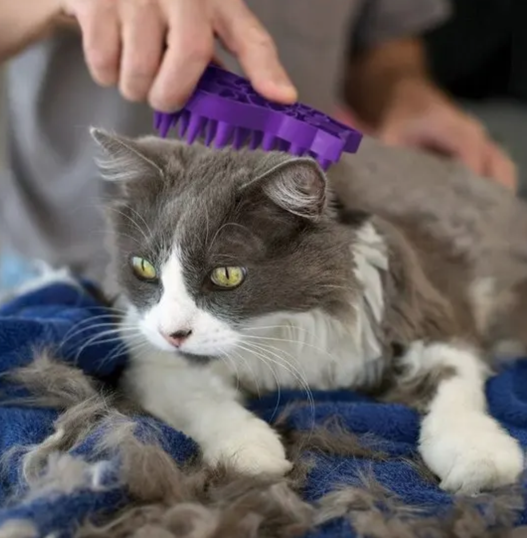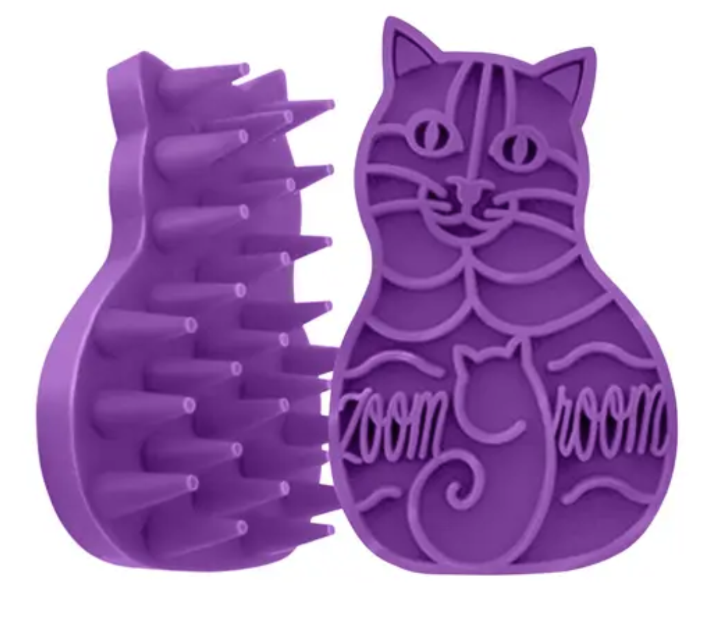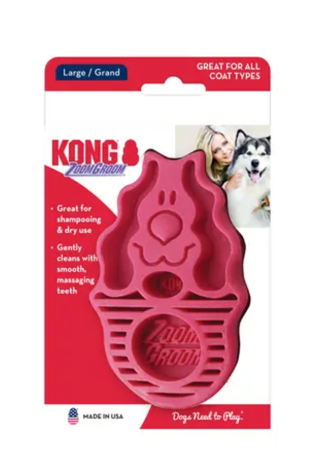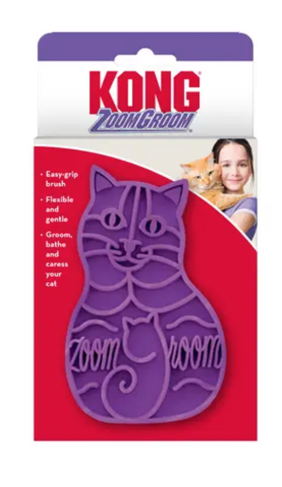 • The KONG® ZoomGroomĀ® for Cats massages and grooms at the same time. The soft, rubber fingers are a magnet for loose hairs. It helps condition skin and reduce hairball formation. The gentle massage action calms cats, especially in potentially traumatic situations such as veterinarian visits.