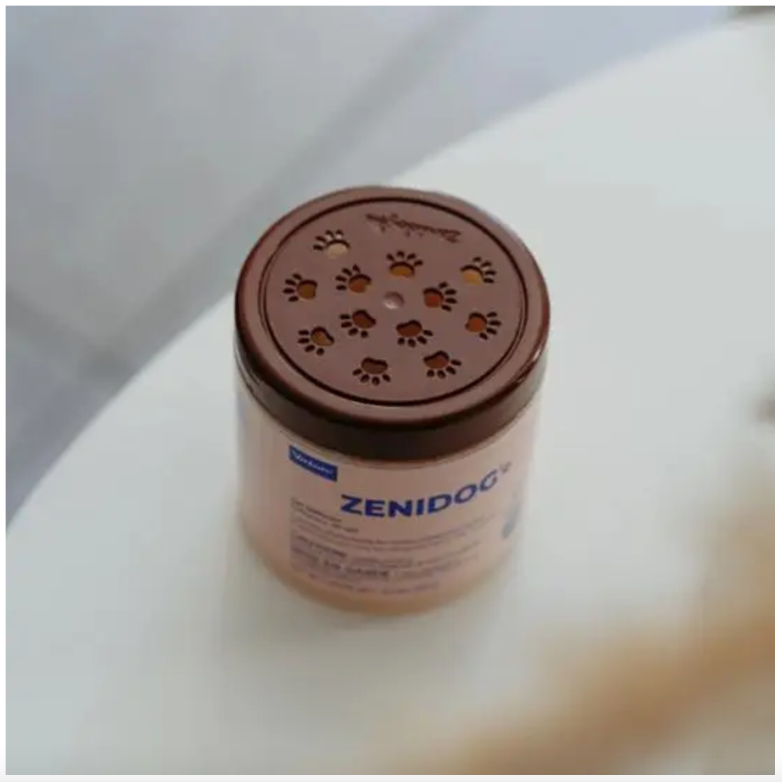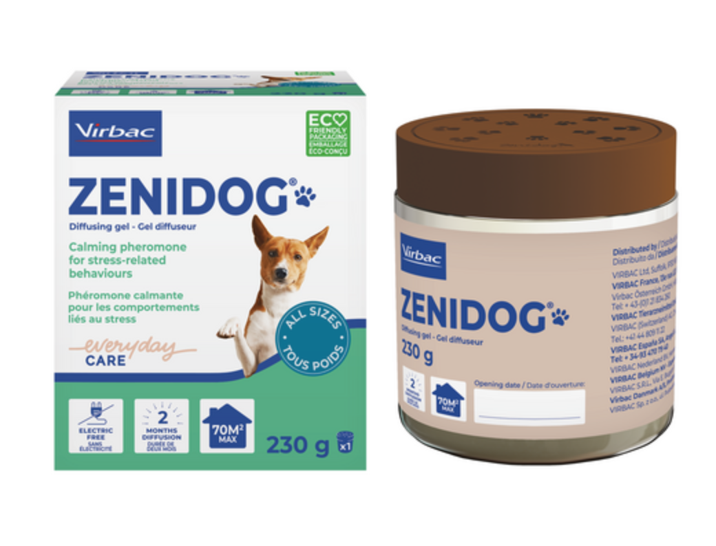 - Zenidog Gel Diffusers contain calming canine appeasing pheromone